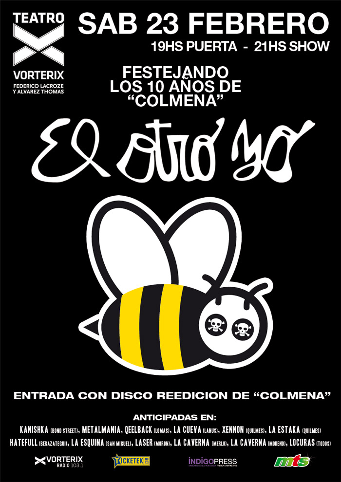 El Otro Yo se presenta en el Teatro Vorterix (Av. Lacroze y Alvarez Thomas) el sábado 23 de febrero desde las 19hs. El mismo día del show al mostrar la entrada será entregado el disco reeditado de "Colmena".